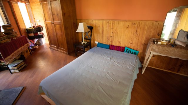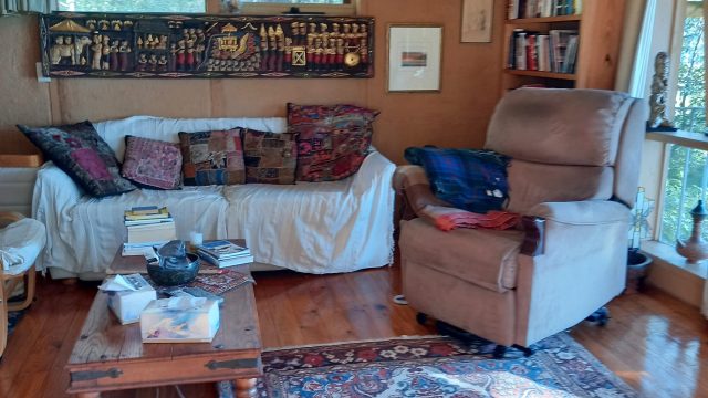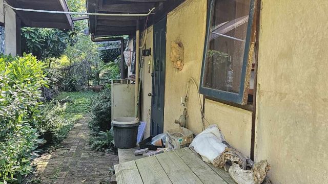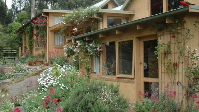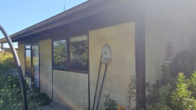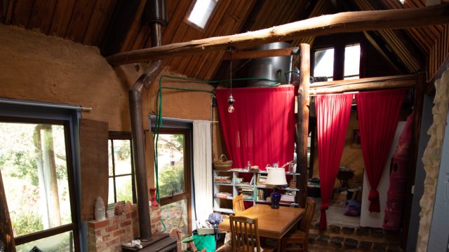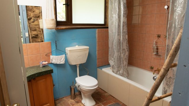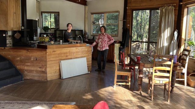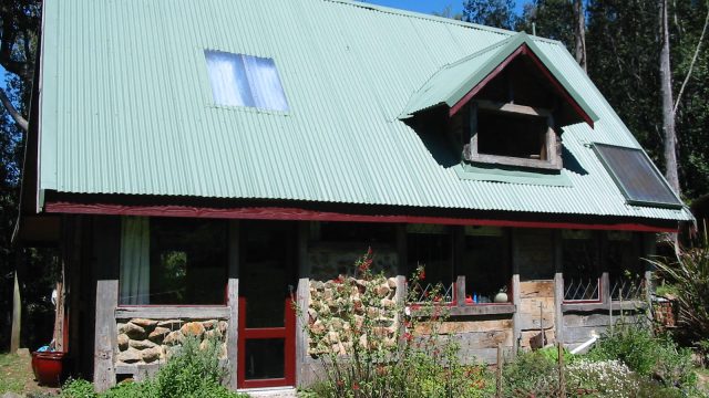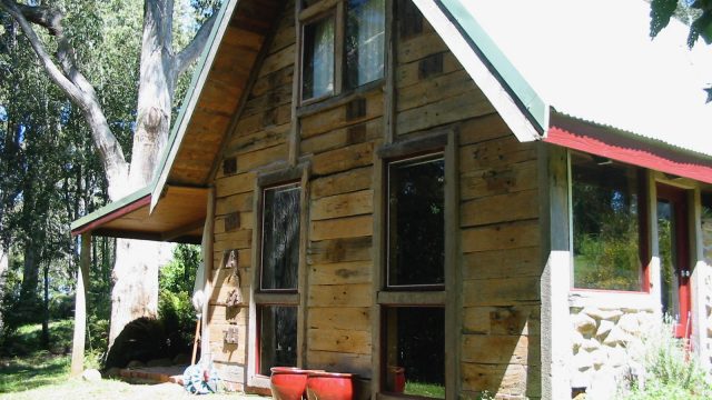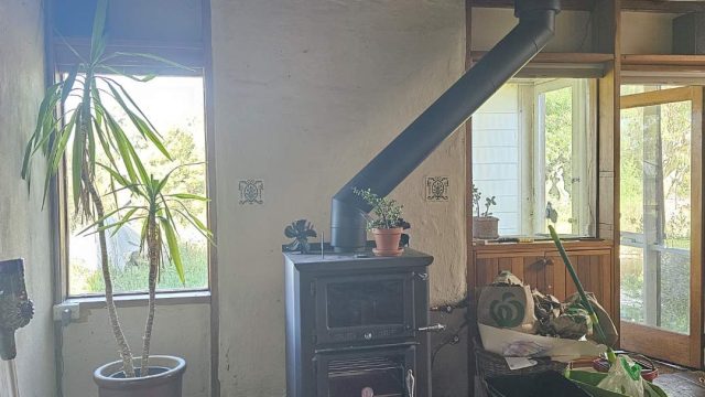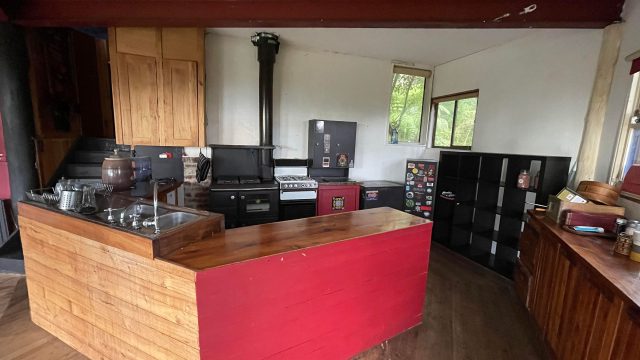 A two-storey main house with an upstairs main bedroom and a downstairs room, with a newly installed wood heater/cooker in the lounger and a kitchen (with a gas stove) and dining area. Across a short brick pathway from the main house is a cottage with two rooms and a wood heater.